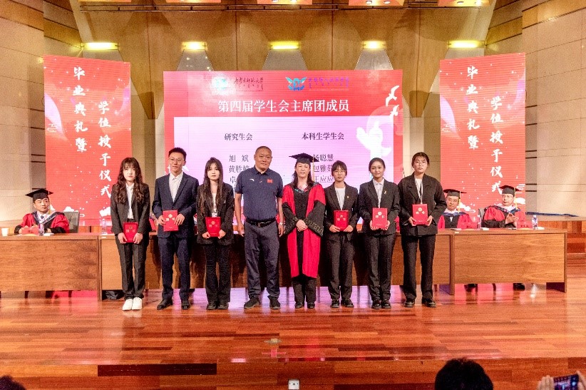 紧接着举行学生干部聘任仪式。由校党委学生工作部部长陆全明和学院党委书记包凤兰为研究生会主席团成员黄胜楠、旭斌、卓拉,本科学生会主席团成员杨聪慧、包雅茹、王应应颁发聘任证书。