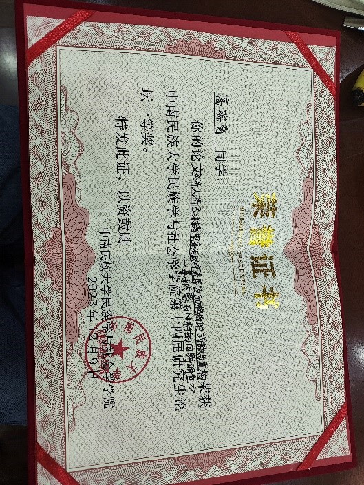 民族学专场结合不同的视角对铸牢中华民族共同体意识下的历史、文化与行动的多元面向进行探讨,新葡萄官网2023级民族学硕士研究生高瑞奇同学以《济人利己:村落农事活动中“差序”互惠格局的式微与重构——基于内蒙古N村的田野调查》为题做汇报,并荣获第十四届研究生论坛民族学专场一等奖。